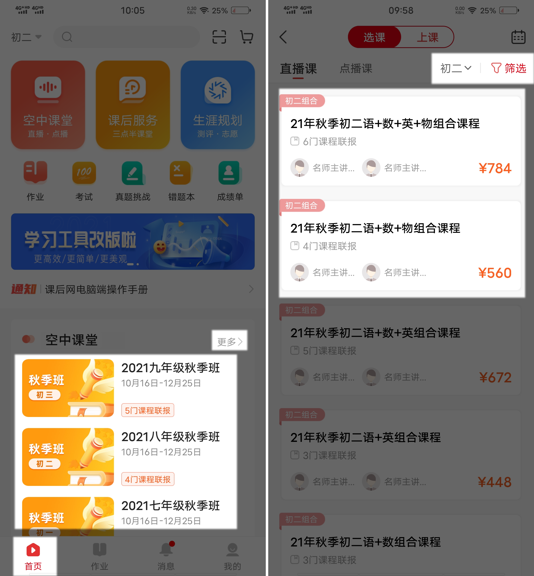 点击下方“首页”,即可看到如图所示课程,也可点击“更多”进入选课界面,通过年级、学科筛选自己所需要的课程进入报名流程。