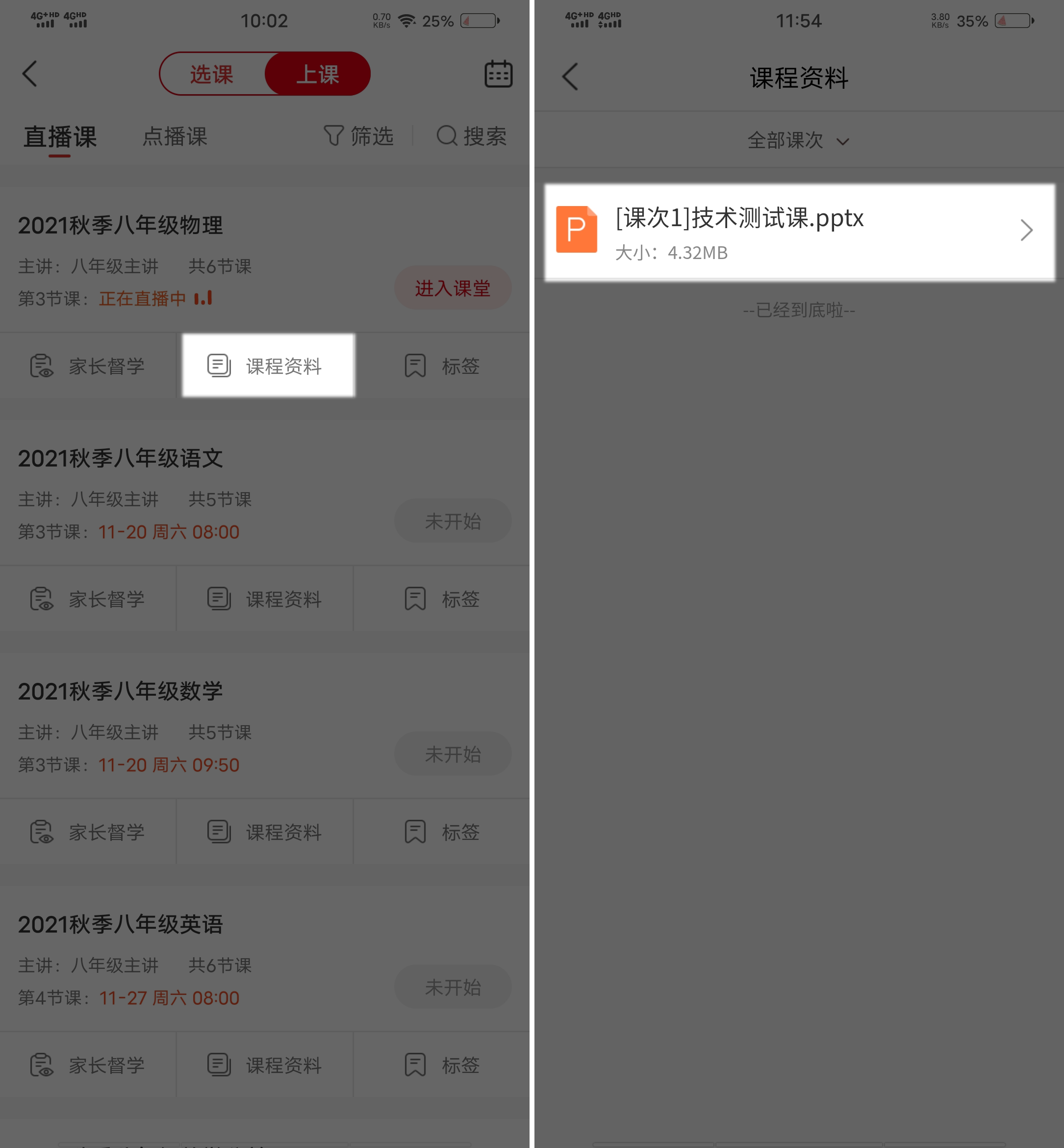 进入直播课界面,选择相应的课程并点击“课程资料”,即可下载查看相应课程课次的课程资料。