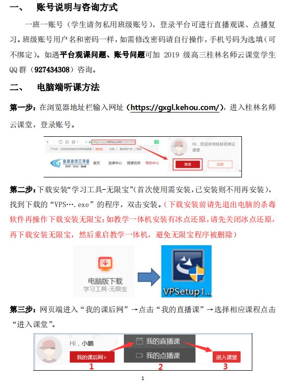 一班一账号(学生请勿私用班级账号),登录平台可进行直播观课、点播复习。班级账号用户名和密码一样,如需修改密码请自行操作,手机号码为选填(可不绑定)。如遇平台观课问题、账号问题可加2019级高三桂林名师云课堂学生QQ群(927434308)咨询。