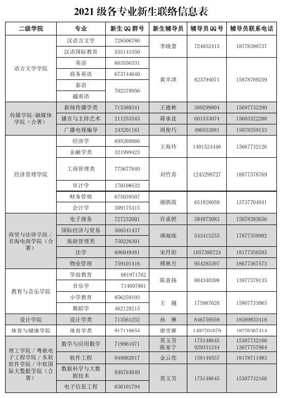 桂林学院2021级各专业新生联络信息表