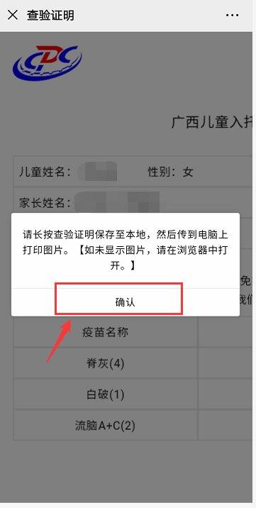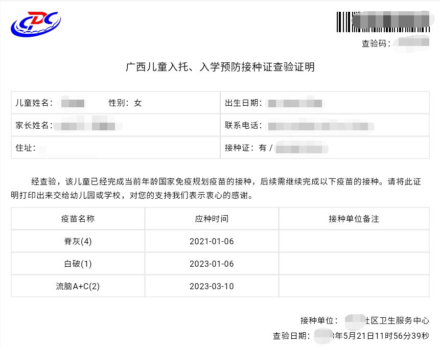 2、“广西接种查验证系统”操作步骤如下,如完成接种的儿童可下载《查验证明》并打印;未完成接种的儿童可查看儿童的漏种疫苗信息,在门诊接种完疫苗后重新进入“广西接种查验证系统”下载《查验证明》:
