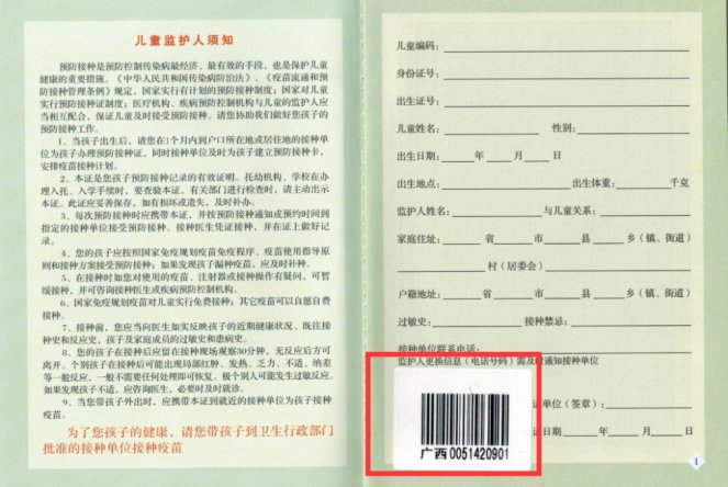 请家长查看手中的接种证,如为广西预防接种证并张贴有广西编码,即可网上自助查验;如接种证遗失,或持有的是外省接种证且无广西编码,家长仍需在门诊进行现场查验。广西预防接种证及广西编码张贴处如下图所示: