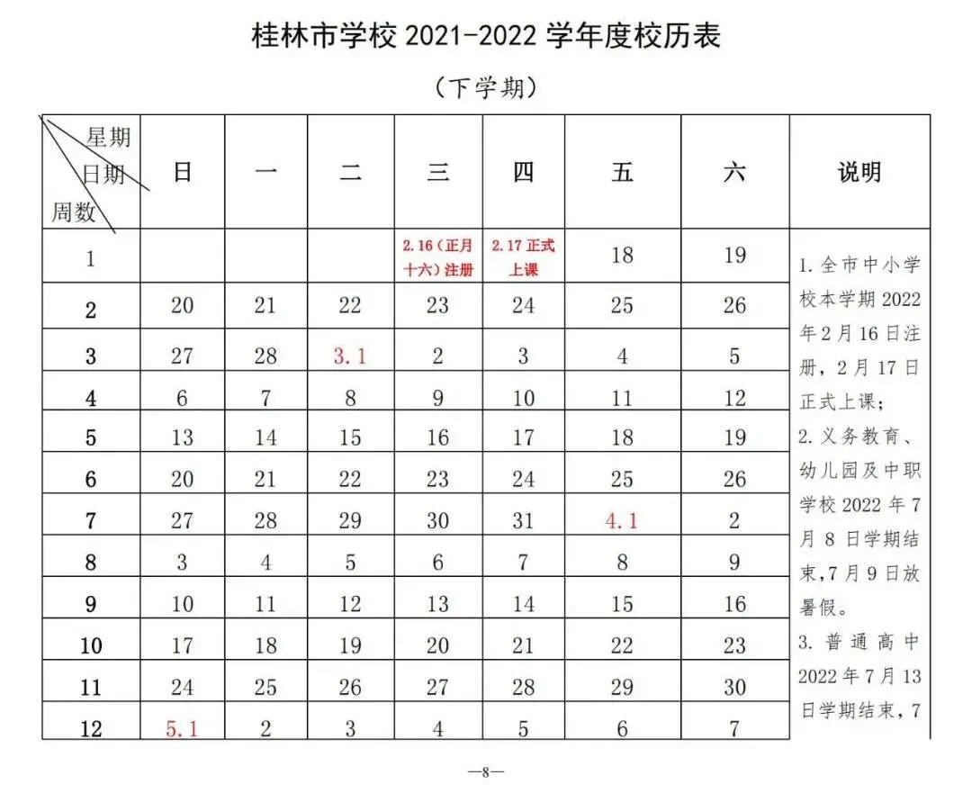2021年桂林市中小学校历(2021年桂林市中小学校历表)