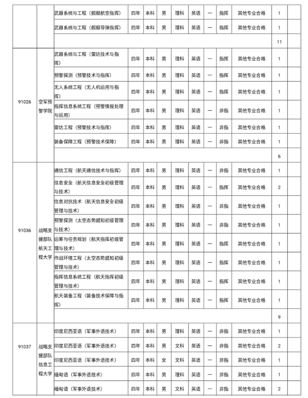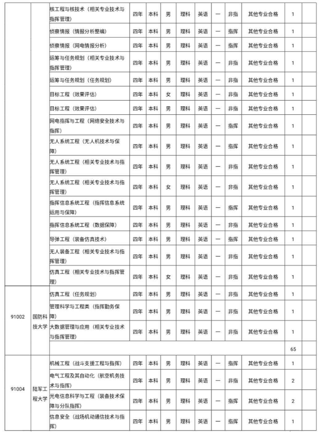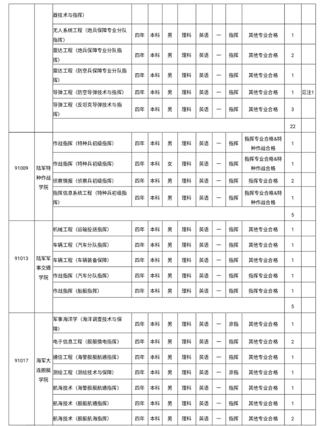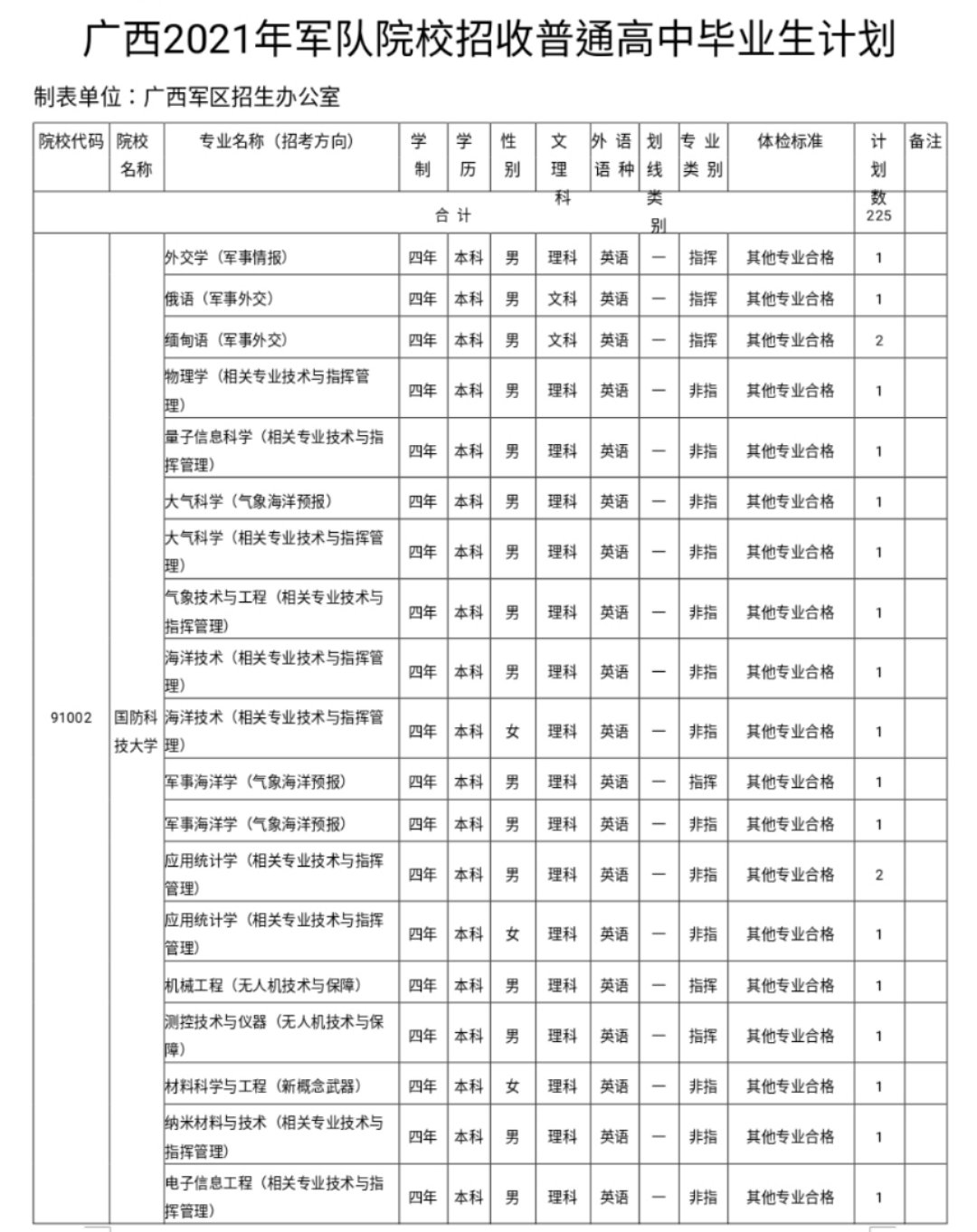 今年有国防科技大学、陆军工程大学、陆军装甲兵学院、陆军炮兵防空兵学院、陆军特种作战学院、陆军军事交通学院、海军大连舰艇学院、空军预警学院、战略支援部队航天工程大学、战略支援部队信息工程大学、武警工程大学、武警警官学院、武警特种警察学院、武警海警学院,共14所军队院校在广西招收普通高中毕业生225人,其中,男生212人,女生13人;理科生212人(含女生11人),文科生13人(含女生2人),划线类别均执行本科第一批录取最低控制分数线。