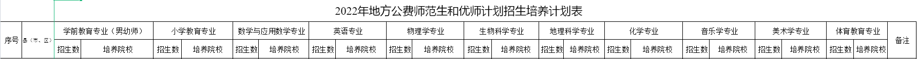 招生专业为小学教育、数学与应用数学、英语、物理学、地理科学、生物科学、化学、音乐学、美术学、体育教育、学前教育,具体招生学校、计划数、定向从教县(市、区)详见《2022年地方公费师范生招生培养计划表》。招生计划纳入学校总计划统筹安排,不单列下达,计划下达后,一律不再追加,不得调整招生计划。