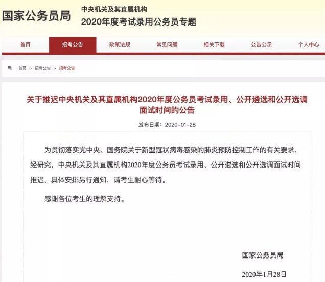 二、中央机关及其直属机构公务员考试录用推迟