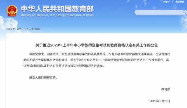 教育部发布通知称,原定于3月中旬进行的中小学教师资格考试和教师资格认定工作推迟举行。具体考试时间和认定报名时间将根据疫情防控进展情况另行通知。