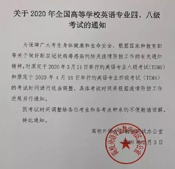 高校外语专业教学测试办公室发布通知称,对原定于2020年3月21日举行的英语专业八级考试(TEM8)和原定于2020年4月18日举行的英语专业四级考试(TEM4)的考试时间进行适当调整,具体考试时间将根据疫情防控工作的开展另行通知。
