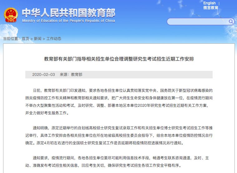 原定4月初左右进行的全国硕士研究生复试工作是否延期将视疫情防控进展情况另行通知。