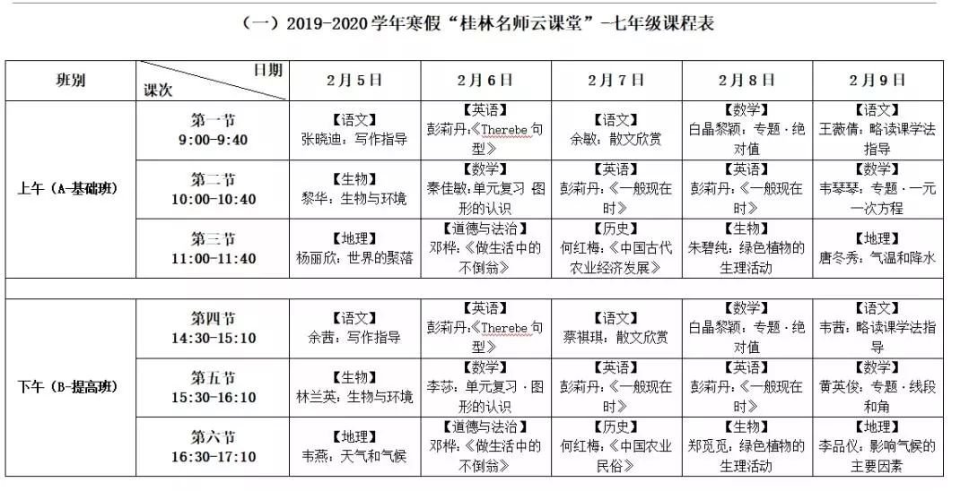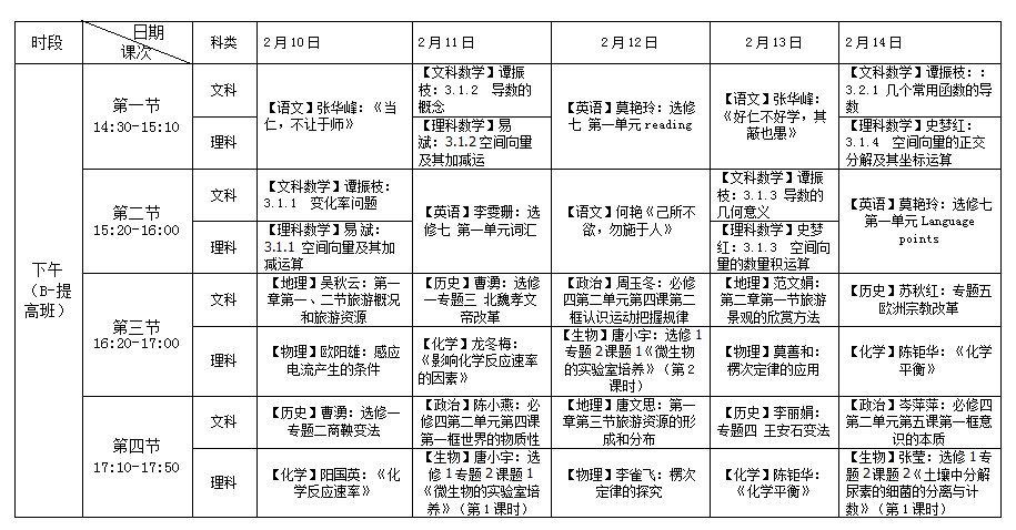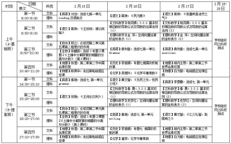 说明:本期课程不分AB班,其中,语文、英语2科不分文理科,数学分文、理,同步授课;语、数、英、理4科各安排6次课,化、政史地4科各安排5次课,生物4次课。各科每次课均为90分钟(即2个课时连堂),合计66次课(共132个课时)。