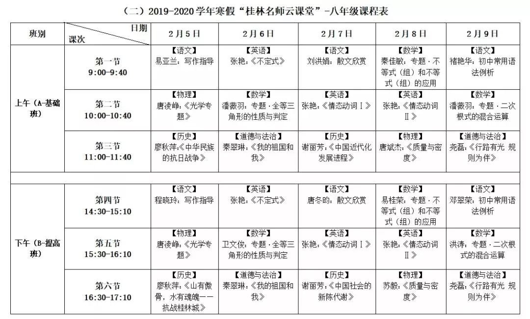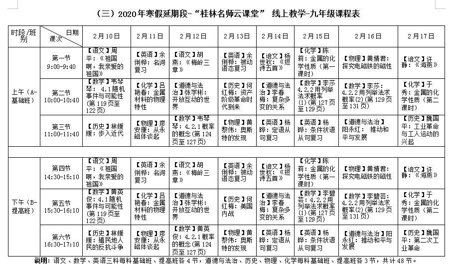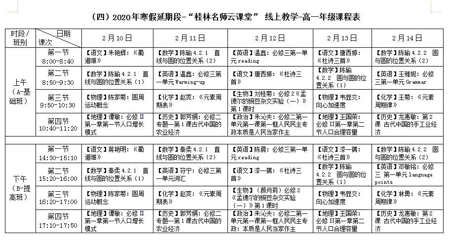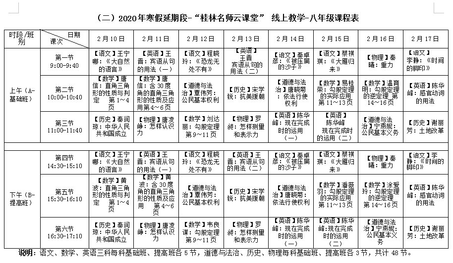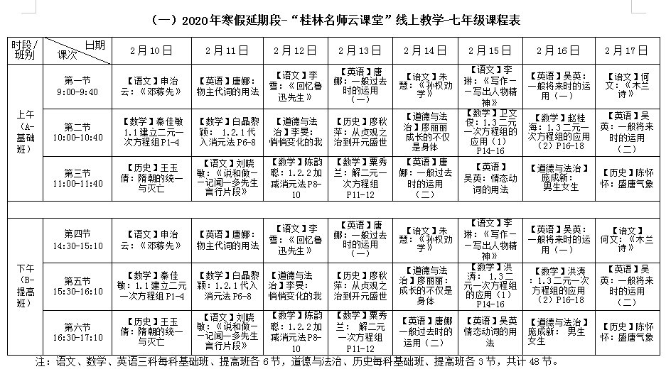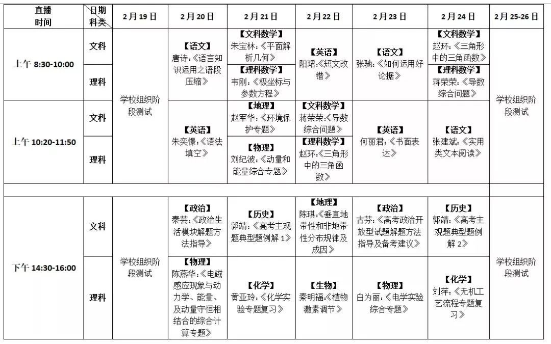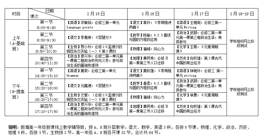 说明:新增高二年级新课线上教学辅导班;按A、B班分层、文理分科授课,文科、理科学生同步听课。语文、文科数学、理科数学、英语4科各6节,其中语文、英语不分文理科,同一课次文理科学生同时收看相同课程;物理、化学、历史、地理4科各5节,生物、政治2科各4节。同一层次文、理科各开课32节,A、B班合计共104节。