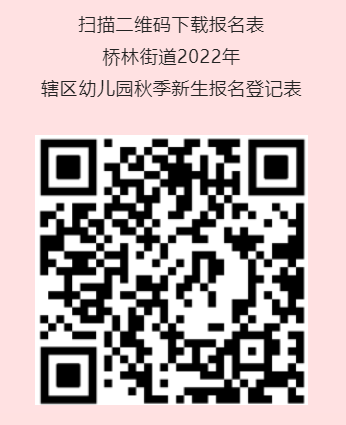 符合入园条件的适龄幼儿家长自行下载秋季新生报名登记表,完整、如实填写打印。(扫描二维码下载报名表桥林街道2022年辖区幼儿园秋季新生报名登记表)