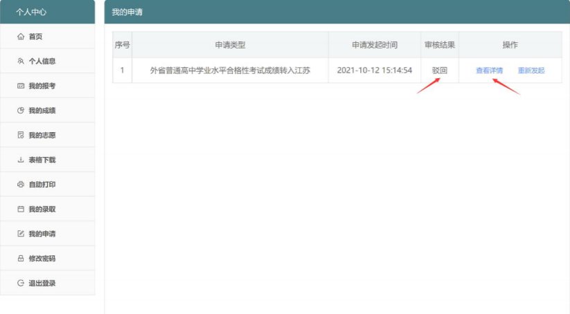 8、提交申请后可再次从“我的申请”进入“外省普通高中学业水平合格性考试成绩转入江苏”申请页面点击“点击进入”查看“审核结果”进度。