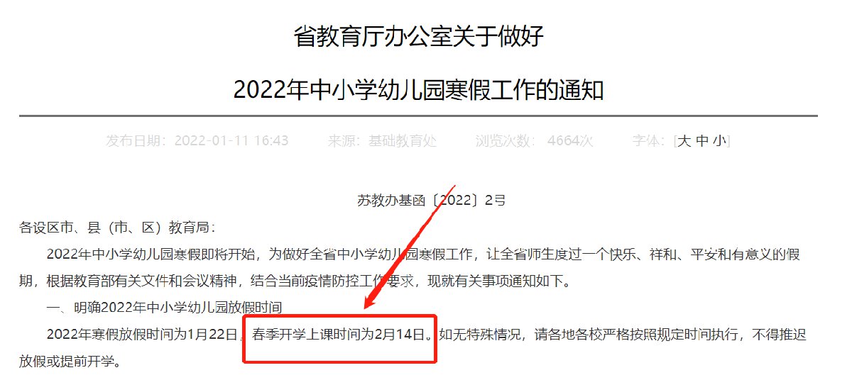 根据2022年1月11日江苏省教育厅发布的《关于做好2022年中小学幼儿园寒假工作的通知》可知:
