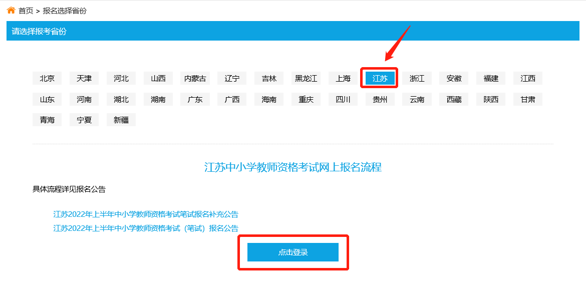 1、登录。考生登录“中小学教师资格考试网”,查看江苏报名公告,按照导航页面指引进入江苏省报名入口。