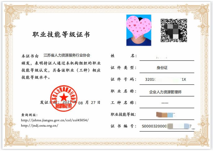 江苏省人力资源服务行业协会企业人力资源管理师证书样式(附图)