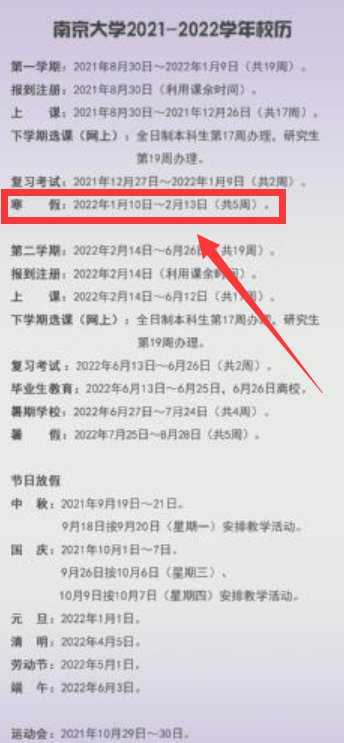 南京大学寒假放假时间:2022年1月10日——2022年2月13日,共计放假5周。