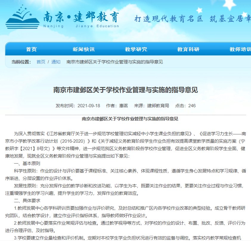 南京市建邺区2021年9月18日发布了《南京市建邺区关于学校作业管理与实施的指导意见》,对小学各学科作业提出具体要求。