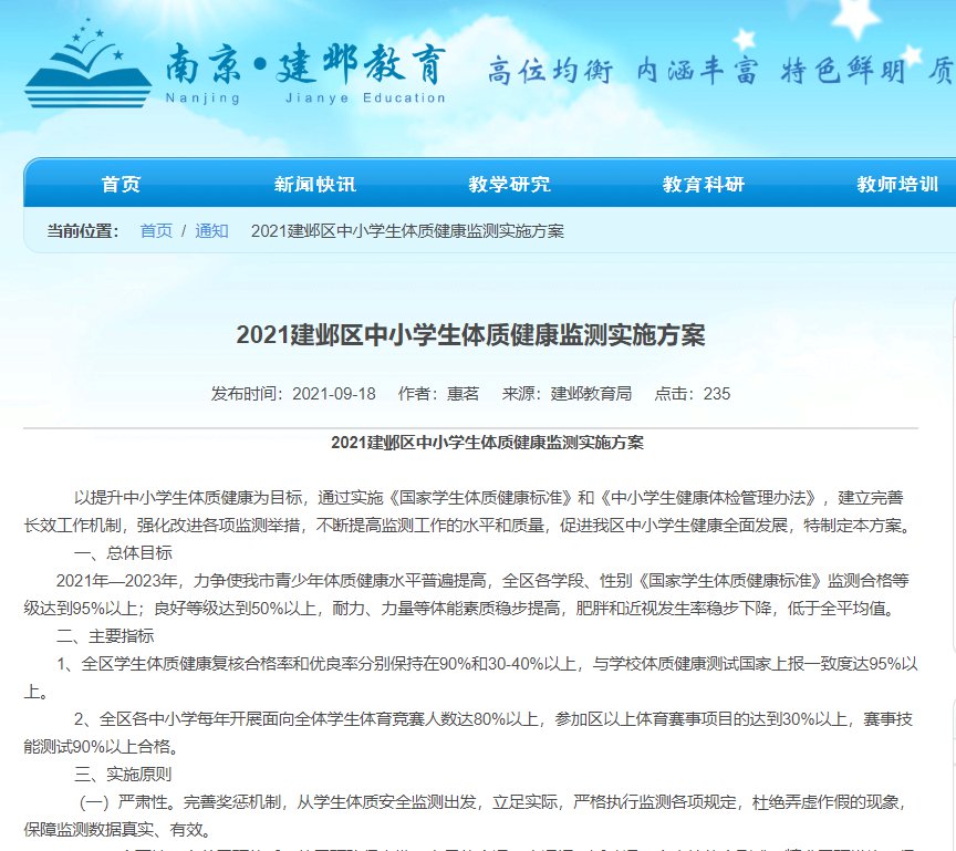 2021年9月18日南京市建邺区发布了《2021年建邺区中小学生体质健康检测实施方案》,该方案确定了南京市建邺区中小学体质健康主要指标,具体如下: