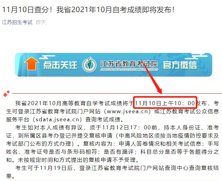 江苏省2021年10月高等教育自学考试成绩于2021年11月10日上午10:00发布