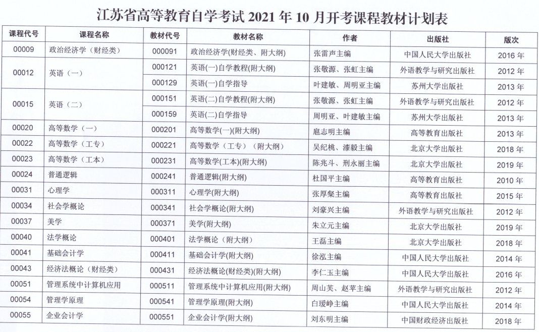 江苏省2021年10月自考开考课程教材计划