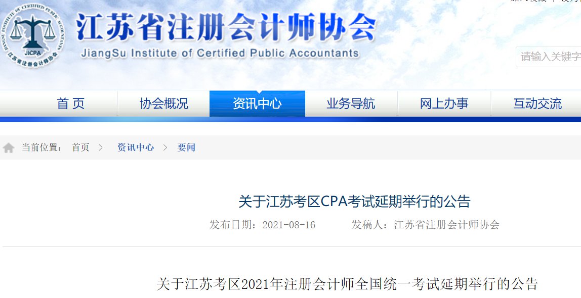 关于江苏考区CPA考试延期举行的公告 2021江苏cpa考试会延期吗
