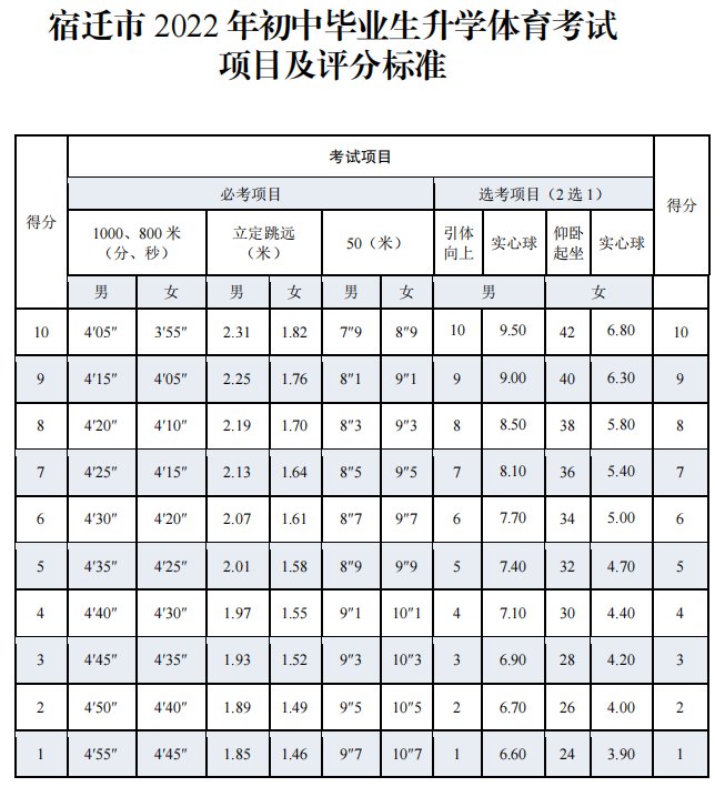 宿迁市2022中考体育考试项目及评分标准