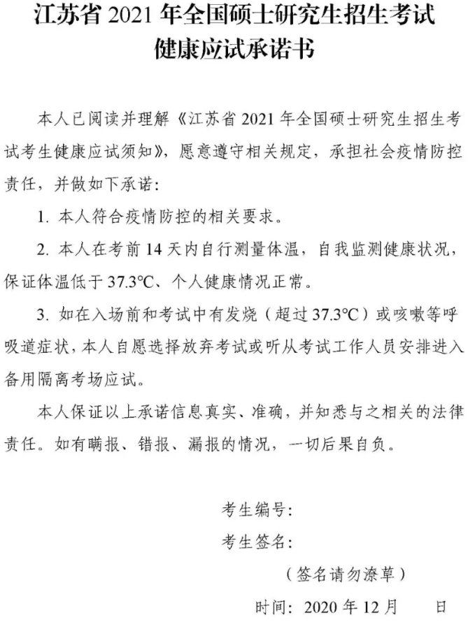 >>>《江苏省2021年全国硕士研究生招生考试健康应试承诺书》下载入口:点击下载