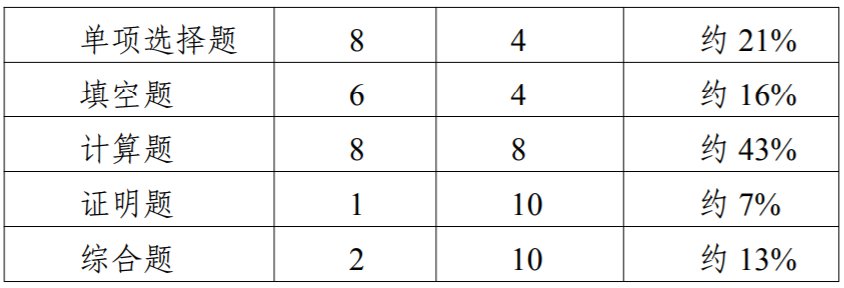 【考查内容】原函数和不定积分的概念 不定积分的基本性质 基本积分公式 定积分的概念和性质 定积分的几何意义 变上限定积分所确定的函数及其导数 牛顿-莱布尼茨公式 不定积分和定积分的换元积分法与分部积分法 简单有理函数与简单无理函数的积分 无穷限反常积分 定积分的微元法 定积分的几何应用