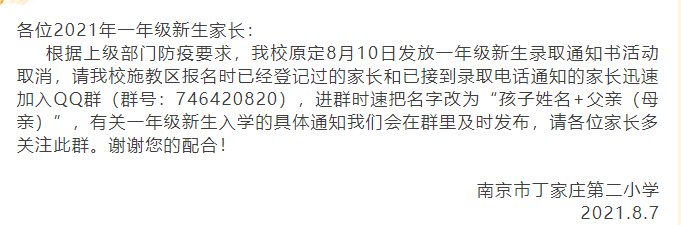 由于疫情的影响,南京市丁家庄第二小学原定2021年8月10日发放一年级新生录取通知书活动取消。