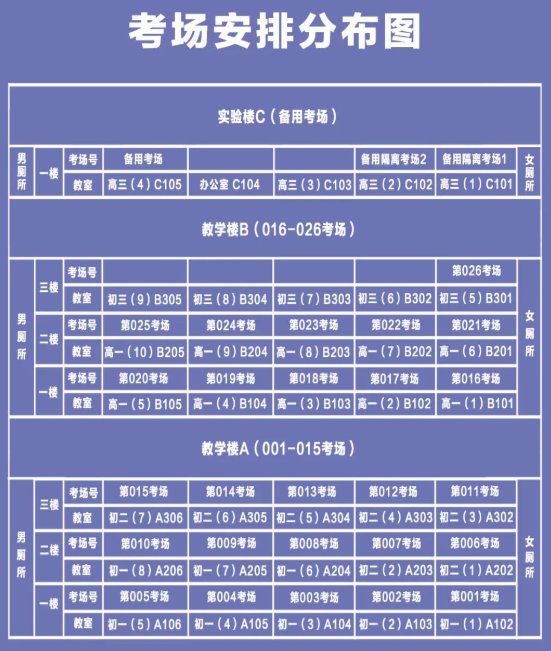 2、考场安排:26个正式考场、3个备用考场