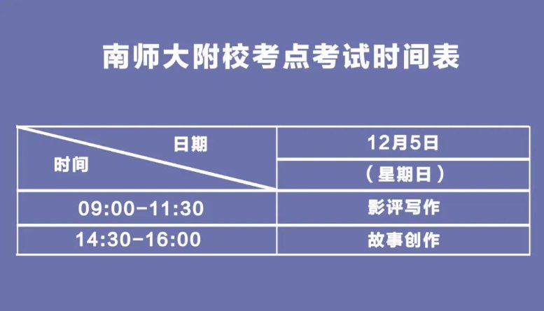 江苏省2022年高校招生广播电视编导专业统考将于2021年12月5日开考。南京地区的所有考生在南京师范大学附属实验学校考点参加考试。考场相关安排如下: