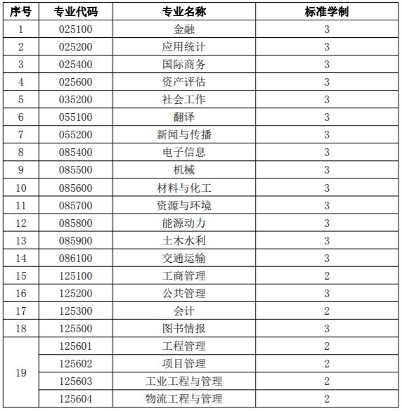 攻读学术学位硕士的标准学制为3年,攻读专业学位硕士的标准学制为2年或3年,学习年限最短不少于2年,最长不超过5年。各专业学位硕士的标准学制详见下表。
