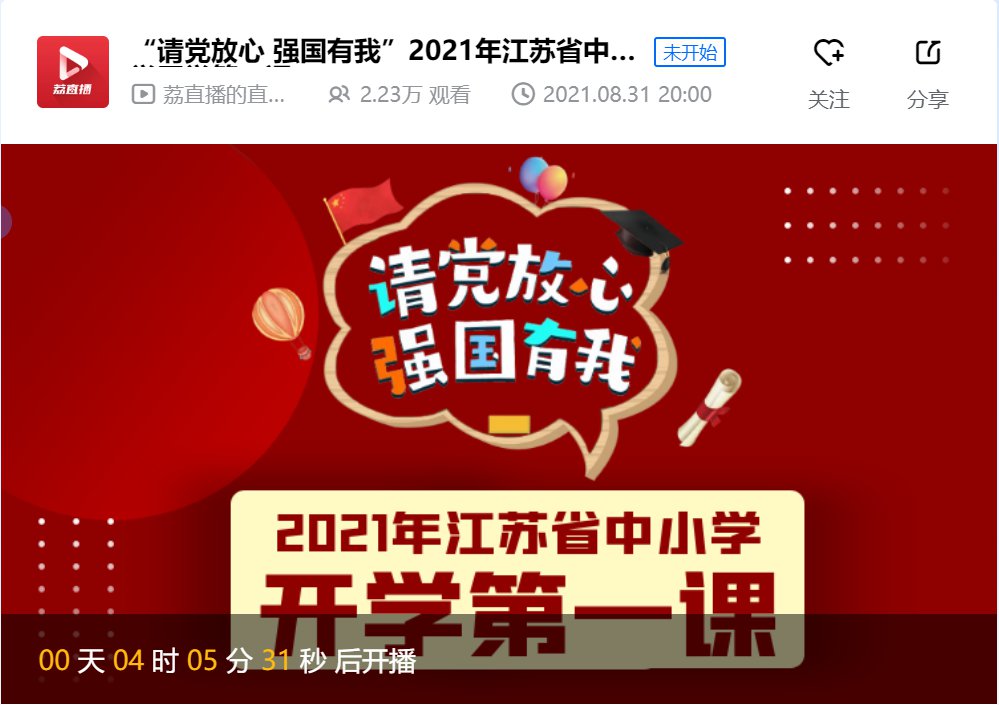2021年江苏省“请党放心 强国有我”开学第一课于2021年8月31日8:00在荔直播准时播出。