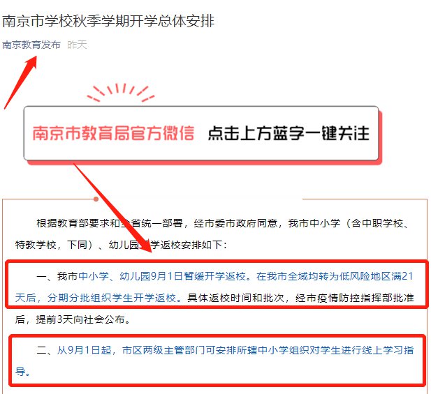 根据南京疫情防控的需要,南京市内初级中学9月1日暂缓开学返校。在南京市市全域均转为低风险地区满21天后,分期分批组织学生开学返校。