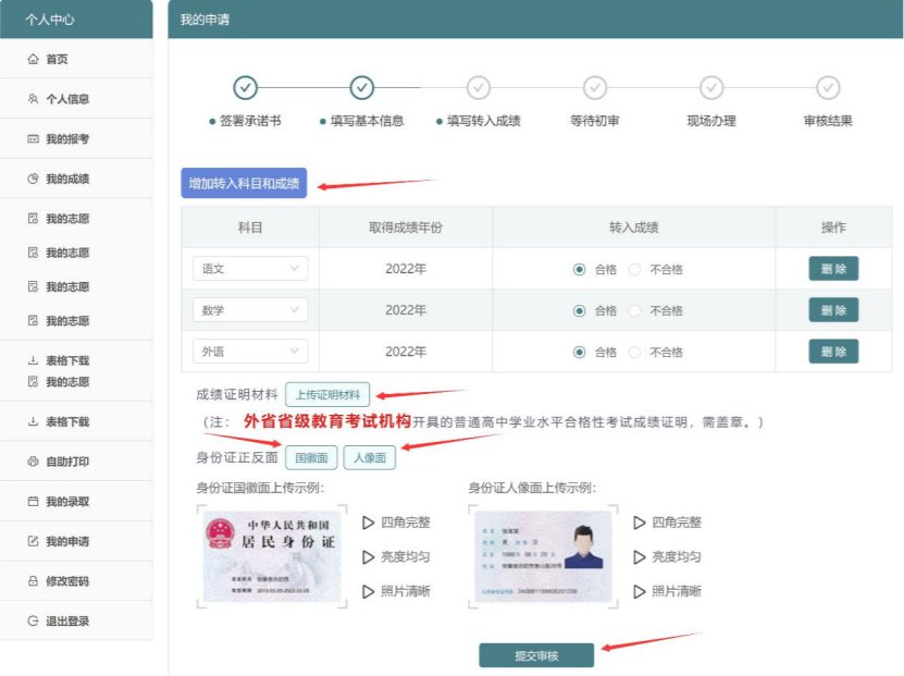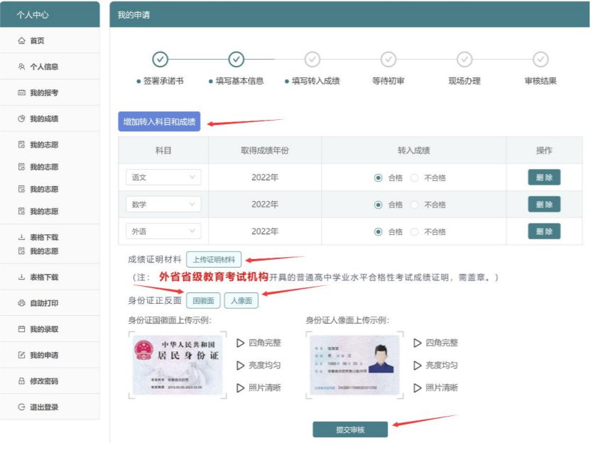 6、点击“增加转入科目和成绩”添加科目和成绩,并且点击“上传证明材料”上传成绩证明材料、点击“国徽面”和“人像面”上传身份证正反面后再点击“提交审核”。