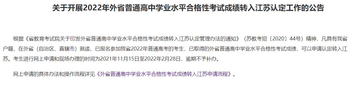 2022年外省普通高中学业水平合格性考试成绩转入江苏认定网上申请和现场办理的时间为2021年11月15日至2022年2月28日,逾期不予补办。