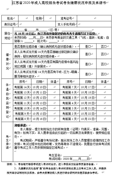 点击下载:《江苏省2020年成人高校招生考试考生健康状况申报及承诺书》