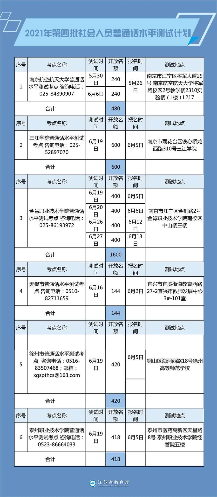 江苏省2021年第四批面向社会人员普通话水平测试计划发布如下(注:报名时间从当日上午9:00开始,报满为止)。