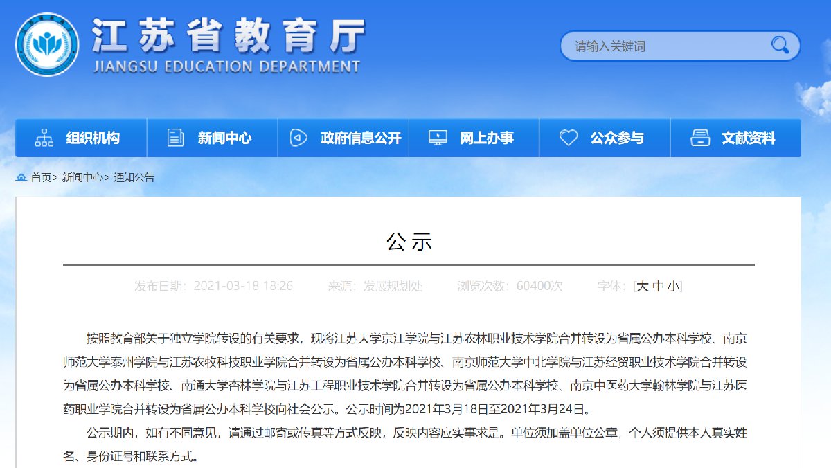按照教育部关于独立学院转设的有关要求,现将江苏大学京江学院与江苏农林职业技术学院合并转设为省属公办本科学校、南京师范大学泰州学院与江苏农牧科技职业学院合并转设为省属公办本科学校、南京师范大学中北学院与江苏经贸职业技术学院合并转设为省属公办本科学校、南通大学杏林学院与江苏工程职业技术学院合并转设为省属公办本科学校、南京中医药大学翰林学院与江苏医药职业学院合并转设为省属公办本科学校向社会公示。公示时间为2021年3月18日至2021年3月24日。