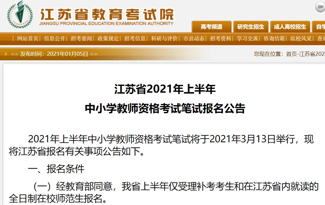 江苏省2021年上半年教师资格证笔试仅受理补考考生和在江苏省内就读的全日制在校师范生报名。
