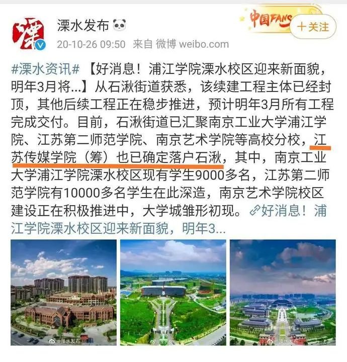 值得注意的是,2020年10月26日,南京市溧水区委宣传部官方微博“溧水发布”曾发布消息称,江苏传媒学院(筹)已确定落户溧水石湫。另外,2020年10月8日,在池州学院举办的第三届中国高校网络视听论坛上,南京艺术学院人文学院院长沈义贞发言时也透露,江苏省正在筹建“江苏传媒学院”。