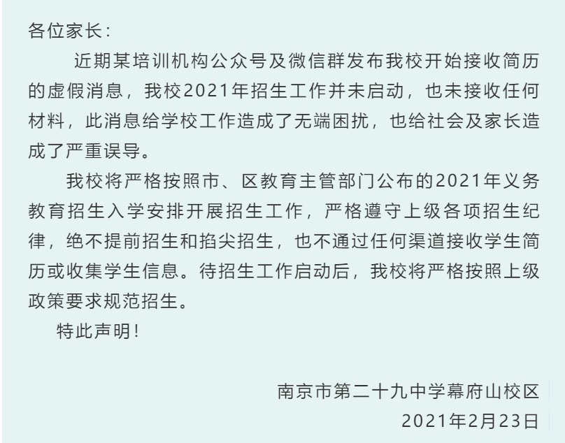 南京市第二十九中学幕府山校区关于2021年招生工作的最新声明