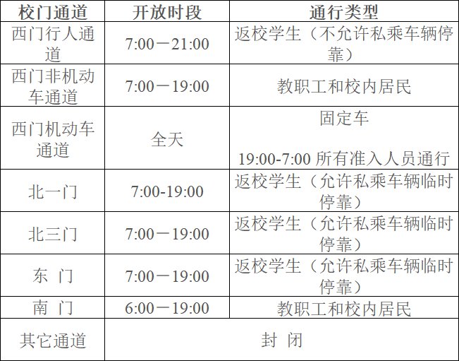所有外来车辆和人员一律不得进入校园,建议学生报到时选择与宿舍位置相近的入口进校,私乘车辆送至除西门以外校门口即可,不得进入校园。