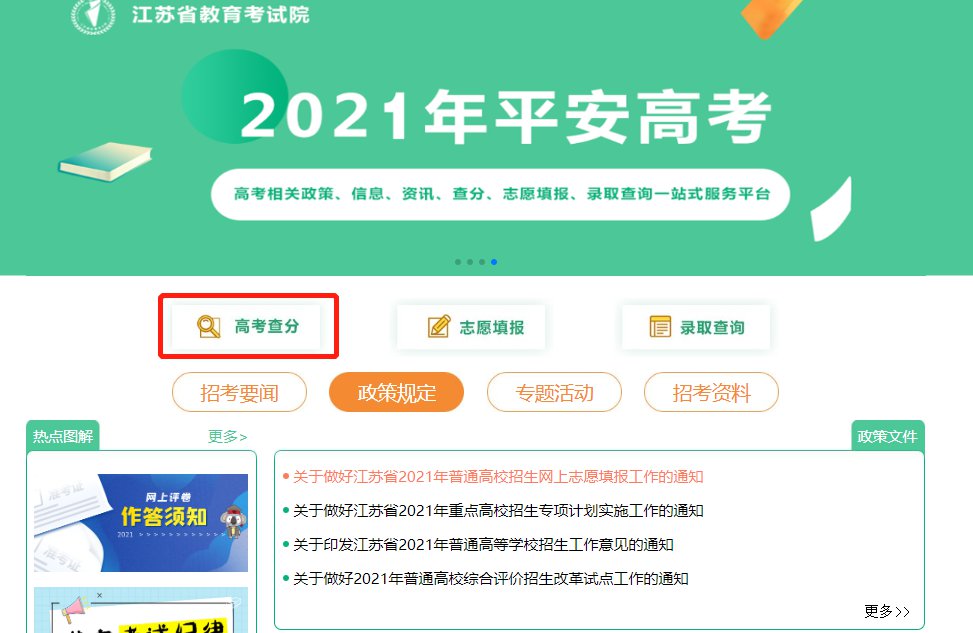 查询步骤:进入“江苏省教育考试院门户网”2021年高考板块,点击“高考查分”进入查分入口。