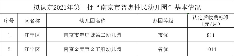 经审核,拟认定南京市翠屏城第二幼儿园等2家幼儿园为2021年第一批“南京市普惠性民办幼儿园”。现从即日起进行公示,公示时间为一周。