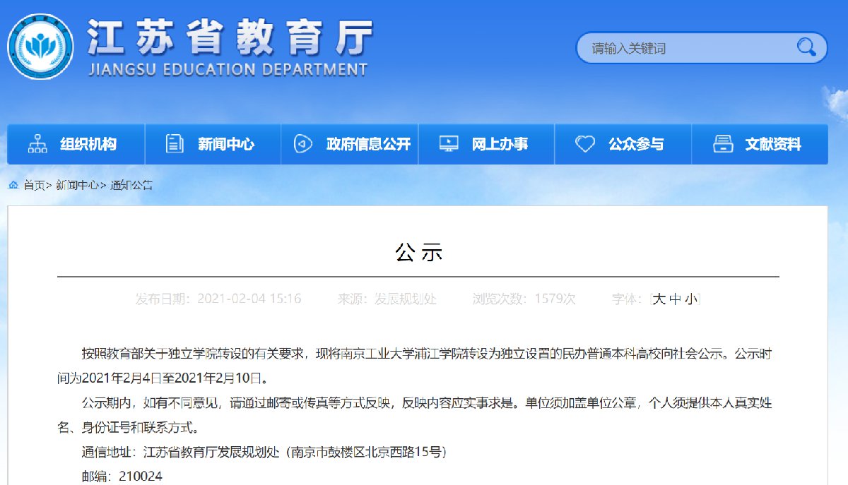 南京工业大学浦江学院将转设为独立设置的民办普通本科高校。