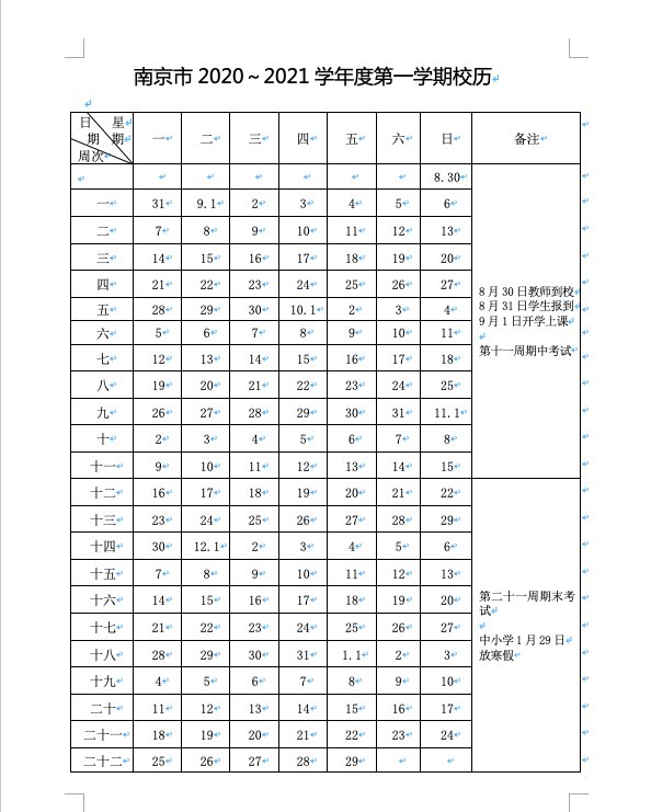 南京市2020~2021学年度校历如下: