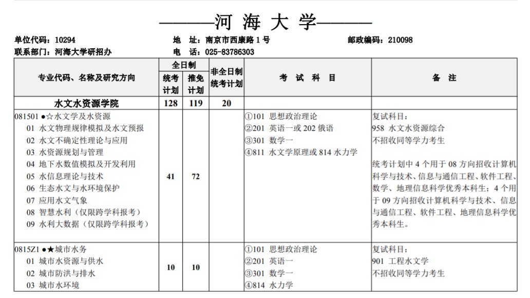 2020河海大学研究生招生专业目录(2021河海大学研究生招生专业目录)