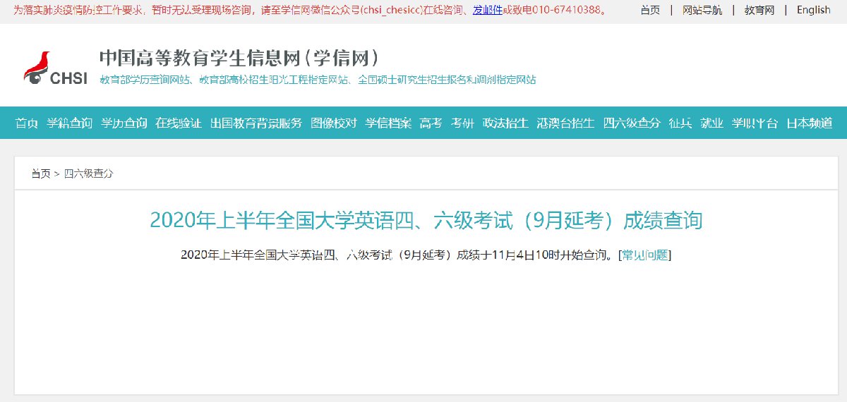 2020年11月4日(周三)10时,2020年上半年全国大学英语四、六级考试(9月延考)成绩将发布,本次成绩(9月19日参加考试)包括英语四六级(仅笔试)及小语种各科目。